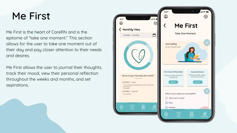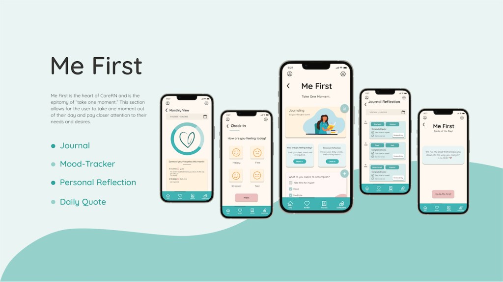 One of the primary reasons that cause nurses to leave the profession is burnout. It is a crucial issue during the COVID‐19 pandemic. New graduate nurses are particularly vulnerable to burnout as they transition to the role of professional nurse. This project is an interdisciplinary collaboration between nursing scientists, targeted users, and designers. Co-design is a collaborative process that actively seeks end-user knowledge and ideas; it directly brings targeted users’ needs and the researcher’s expertise to the project. To ensure that the app was designed based on the needs of targeted users, we co-designed this app with experienced nurses, nursing professors, and newly graduated nurses. Multiple rounds of user tests were done by bringing prototypes to targeted users. Based on testing results, refinements were made by designers. All visual components of this app were explicitly designed to be calming and relaxing. No adjacent visual elements were designed to be with high color contrast. Round shapes were applied if possible. When shapes with angles were necessary, sharp angles were avoided. All page contents were kept as simple as possible. The slogan of this app is “take a moment to take care of yourself”. It is a “safety-house” for newly graduated nurses. In this “safety-house”, users can utilize the fragmented time between work to seek support, do mental exercise, connect with others, and talk to themselves. These are all evidence-based practices to lower the risk of nurse burnout. The designing process of this app was strictly under the principle of human-centered design and design thinking. Through this project, we understand that human-centered and mHealth design should bring more stakeholders to the design process to co-design a better health experience.