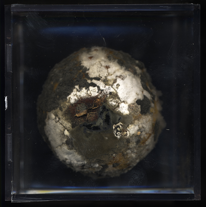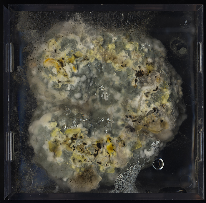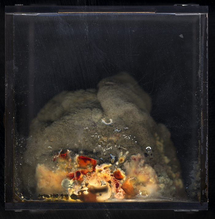 This is an analogy between a decaying fruit enclosed in a cube and a dead body in a coffin. I see a similar vitality and an eternal cycle. There is dying and decaying, but at the same time, new lives are gradually growing. They even will become dust and water to nourish and build more lives in the world. Dust to dust, soil-to-soil, life to death, death to life, and in this way, there is no end of birth, suffering, death and rebirth.