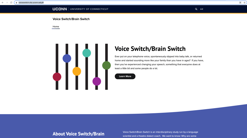 Voice Switch/Brain Switch is an interdisciplinary study run by a language scientist Emily Myers and a theatre dialect coach Jennifer Scapetis-Tycer. Both of them are faculty members at UCONN. I designed the branding system and the DX lab designed/ developed the website for this project in Summer 2021.
